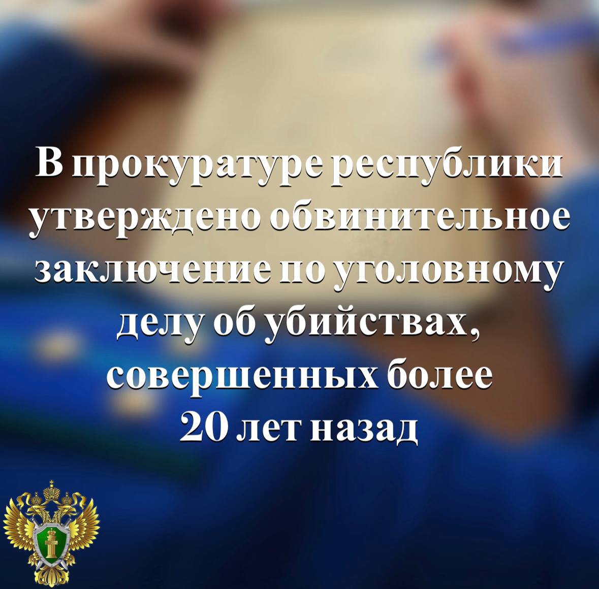 В прокуратуре республики утверждено обвинительное заключение по уголовному делу о преступлениях, предусмотренных п.п. «а,е,з» ч. 2 ст. 105 УК РФ (убийство двух лиц, совершенное общеопасным способом по найму).