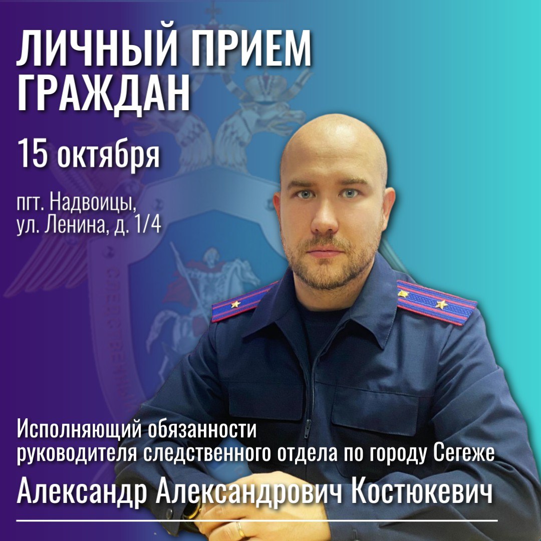 15 октября 2025 года исполняющий обязанности руководителя следственного отдела по городу Сегеже СУ СК России по Республике Карелия Александр Александрович Костюкевич проведет личный прием жителей поселка городского типа Надвоицы Сегежского района.