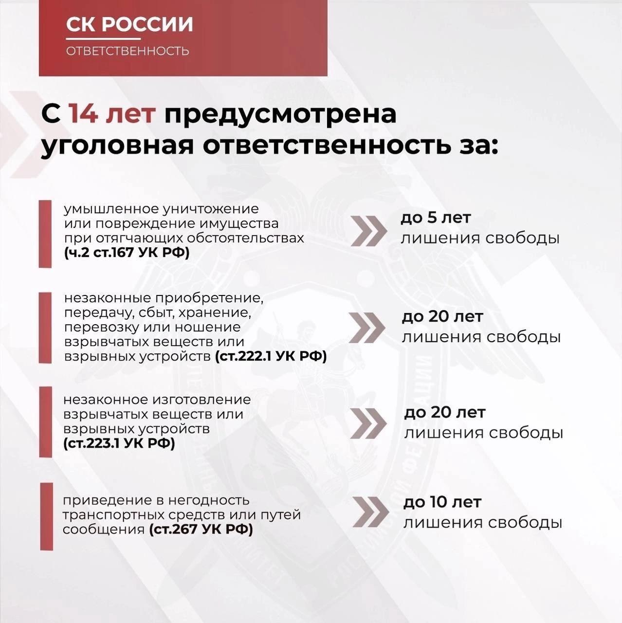 Следственное управление СК России по Республике Карелия напоминает об уголовной ответственности за совершение преступлений против основ конституционного строя и безопасности государства, а также общественной безопасности, по которым предусмотрена уголовная ответственность для лиц, достигших 14-летнего и 16-летнего возраста