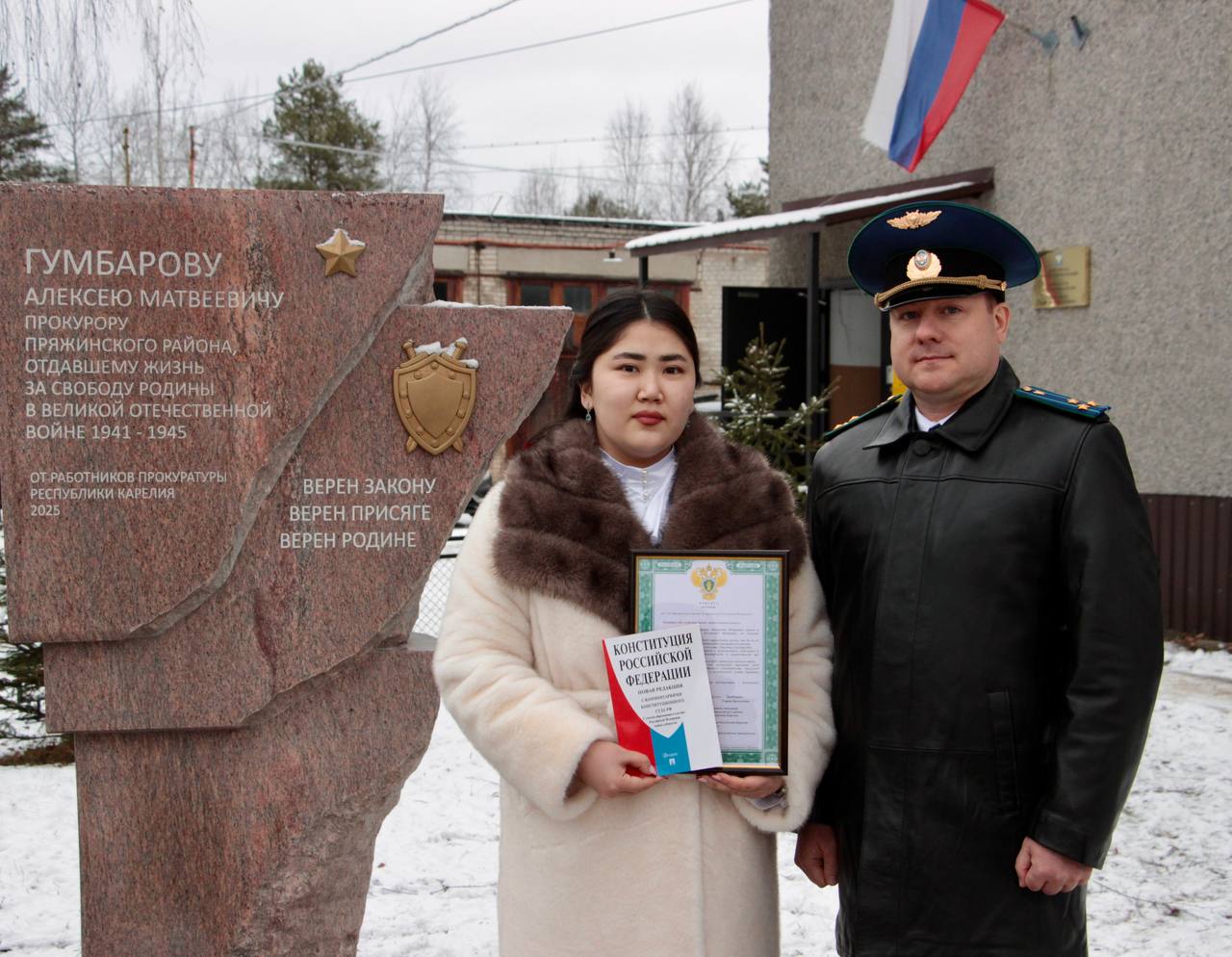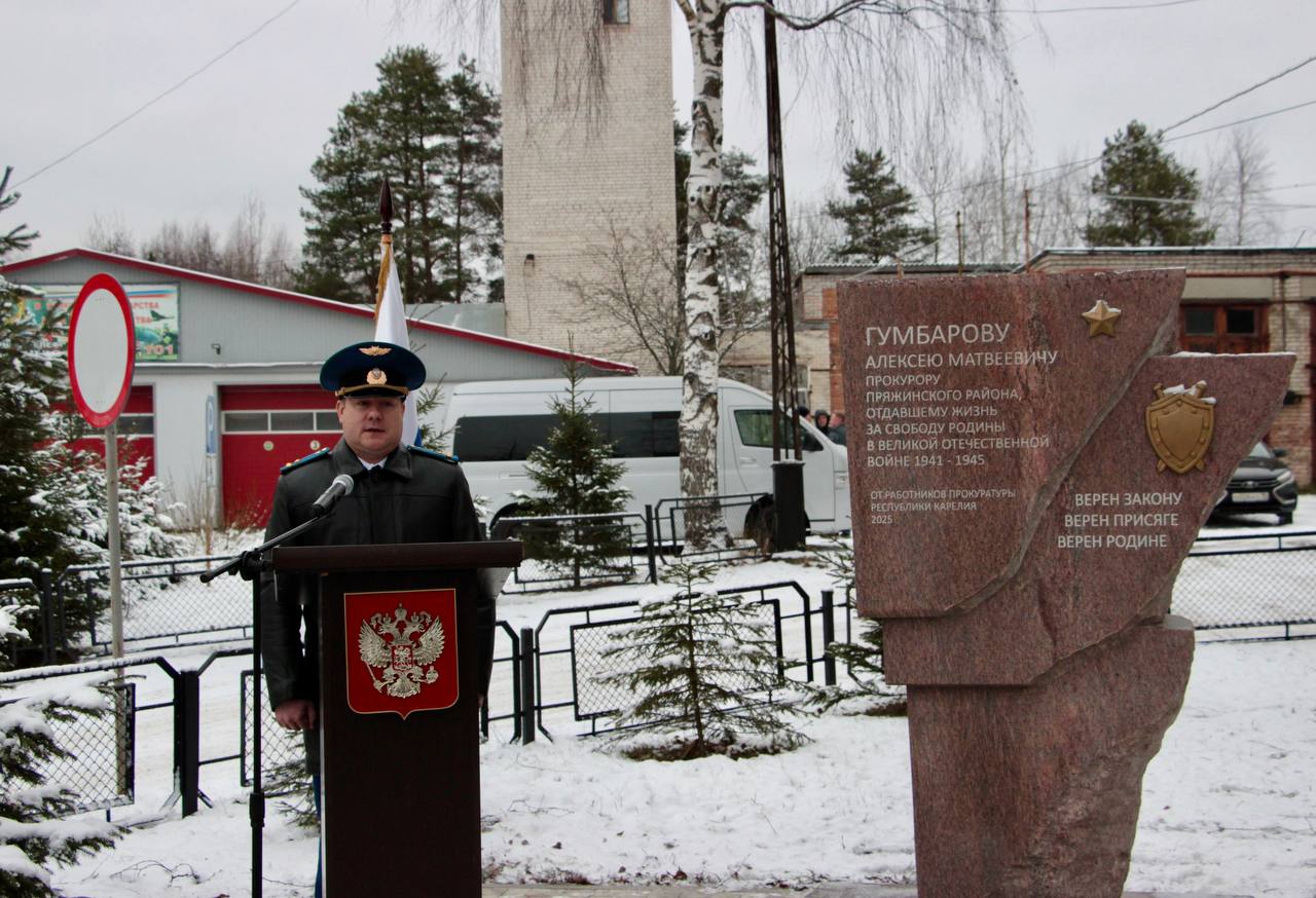 По инициативе прокурора республики Дмитрия Харченкова состоялся совместный выезд молодых специалистов, ветеранов и работников органов прокуратуры республики, представителей Карельского союза бывших малолетних узников фашистских концлагерей, членов национально-культурной автономии белорусов Карелии, а также участников программы «Герои Карелии» к памятнику прокурору Пряжинского района Гумбарову Алексею Матвеевичу – участнику Великой Отечественной войны.