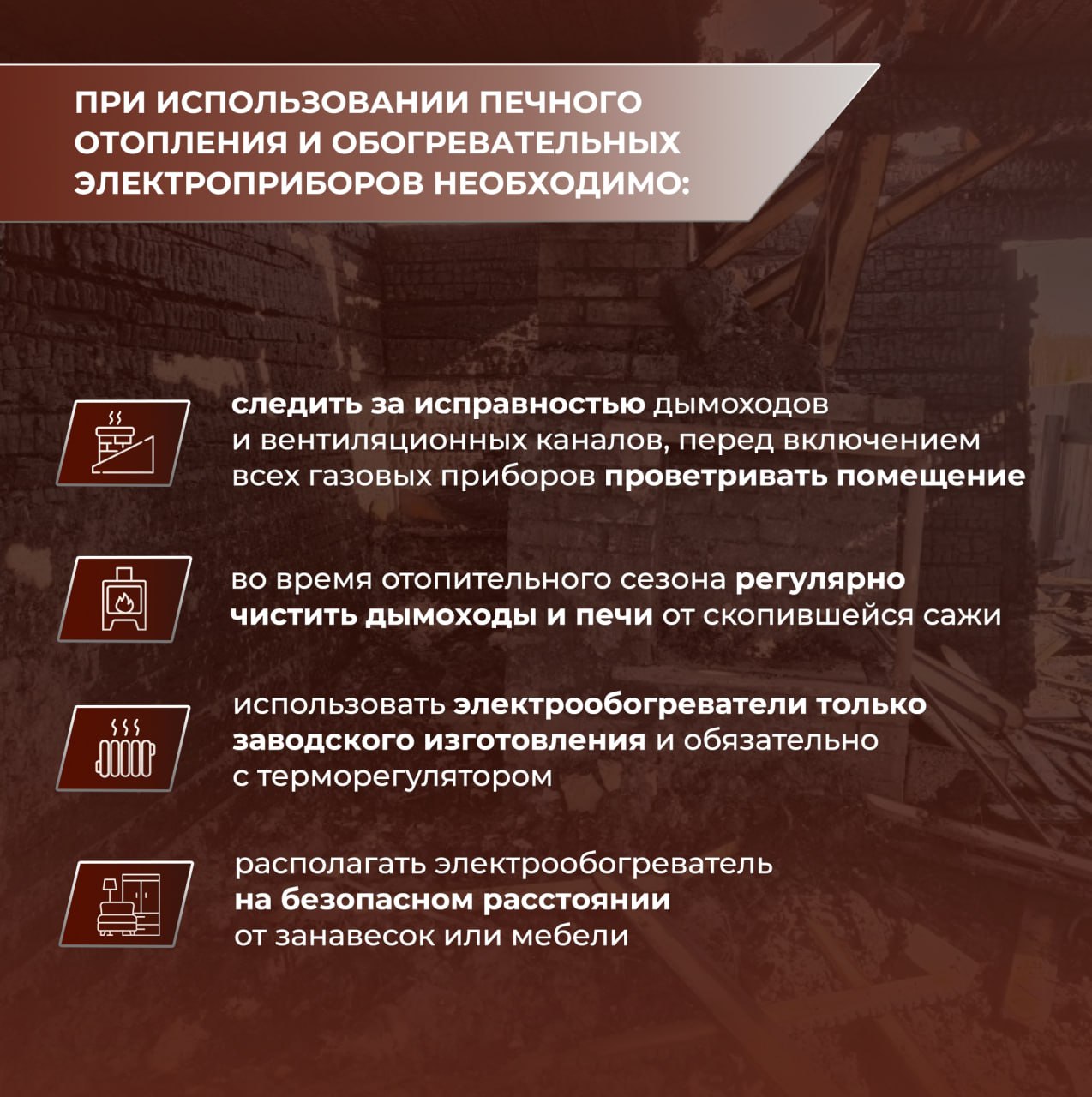 обеспечивайте безопасность эксплуатации обогревательных устройств и кухонных плит, устанавливая их вдали от легковоспламеняющихся материалов и предметов интерьера. Категорически запрещается пользоваться кустарными нагревательными приборами неизвестного происхождения.