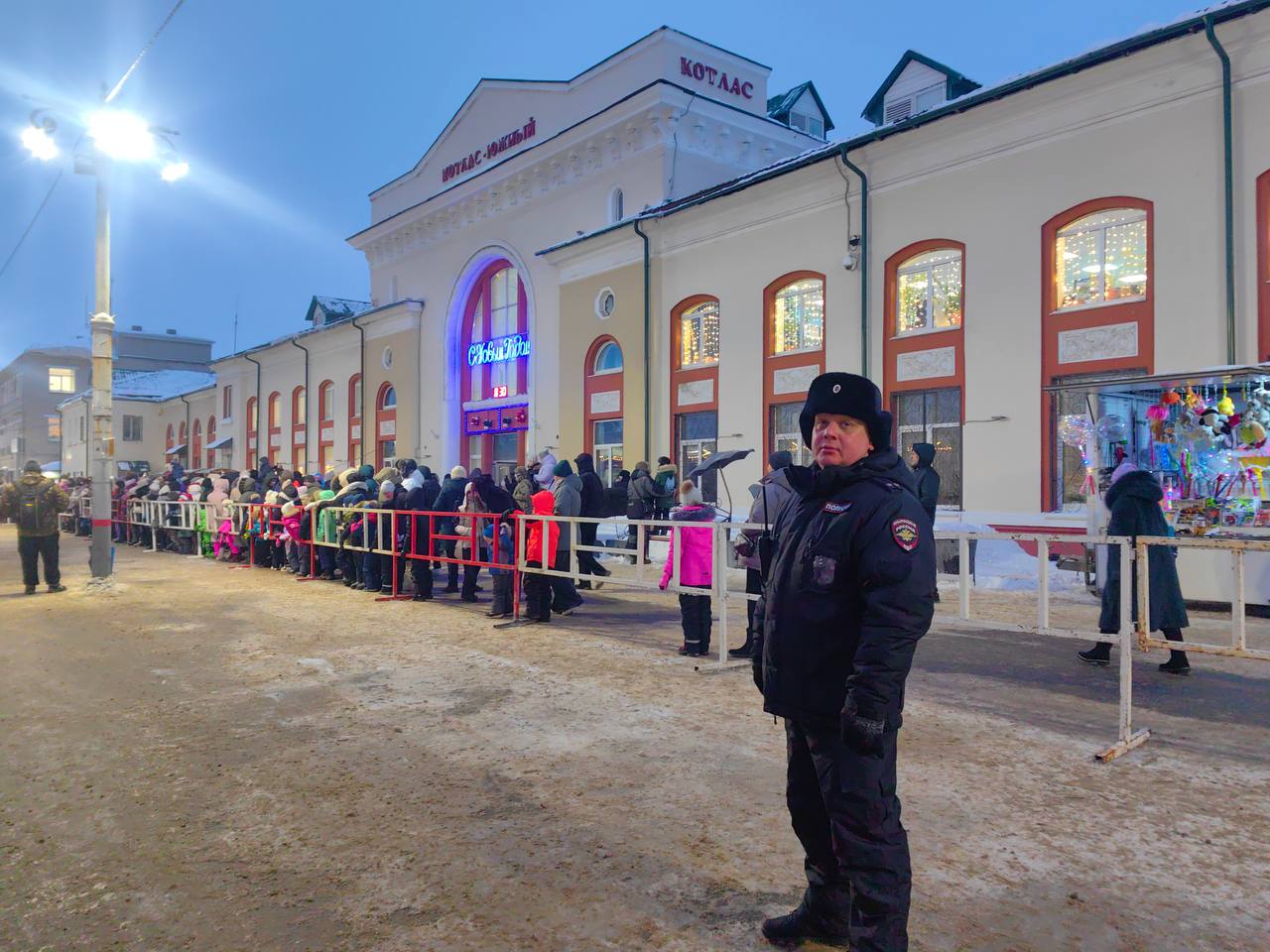 Перед прибытием на Родину сказочная команда дала заключительное новогоднее представление на станции Котлас-Южный. Около тысячи жителей и гостей города Котласа собрались на железнодорожном вокзале, чтобы своими глазами увидеть поезд волшебника из Великого Устюга.