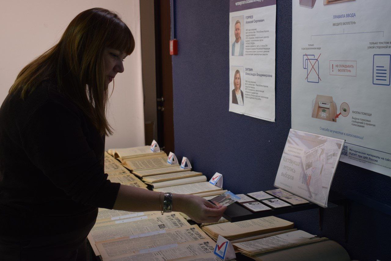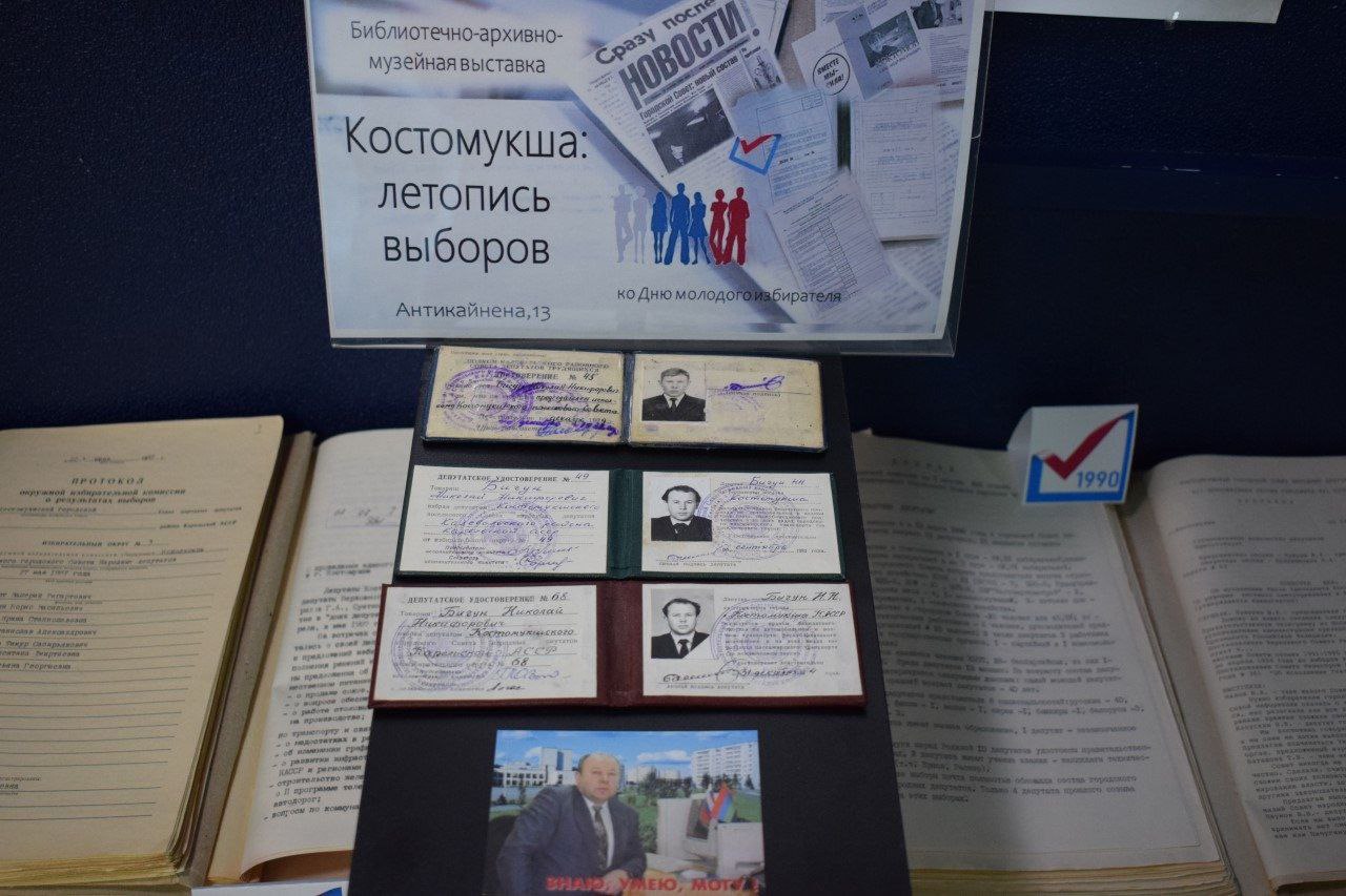 Выставка посвящена истории выборов в городе Костомукша и организована в рамках сотрудничества ТИК Костомукши с центральной библиотекой.