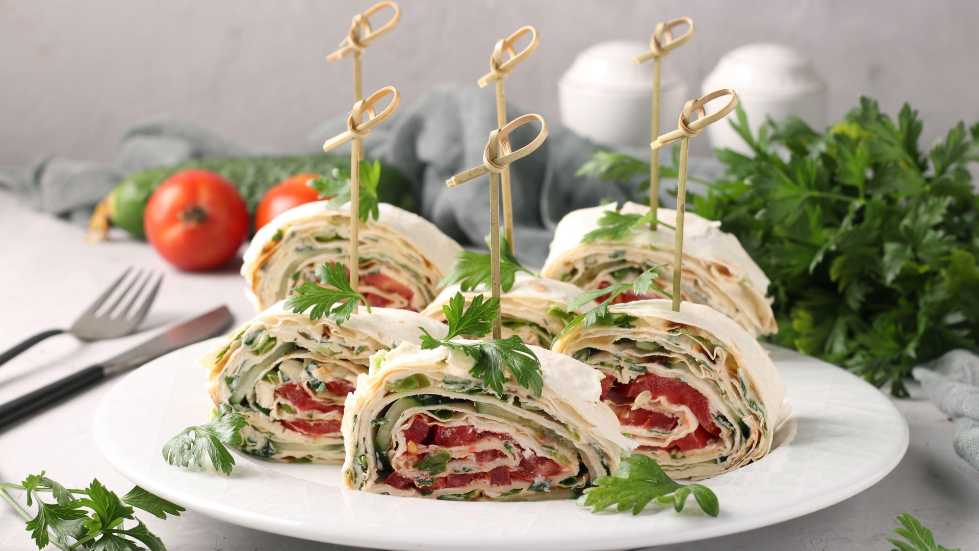Дальше можно собрать 3 маленьких рулетика или один большой. Во втором случае сделайте первый рулет, а затем заверните его в оставшиеся листы лаваша.
