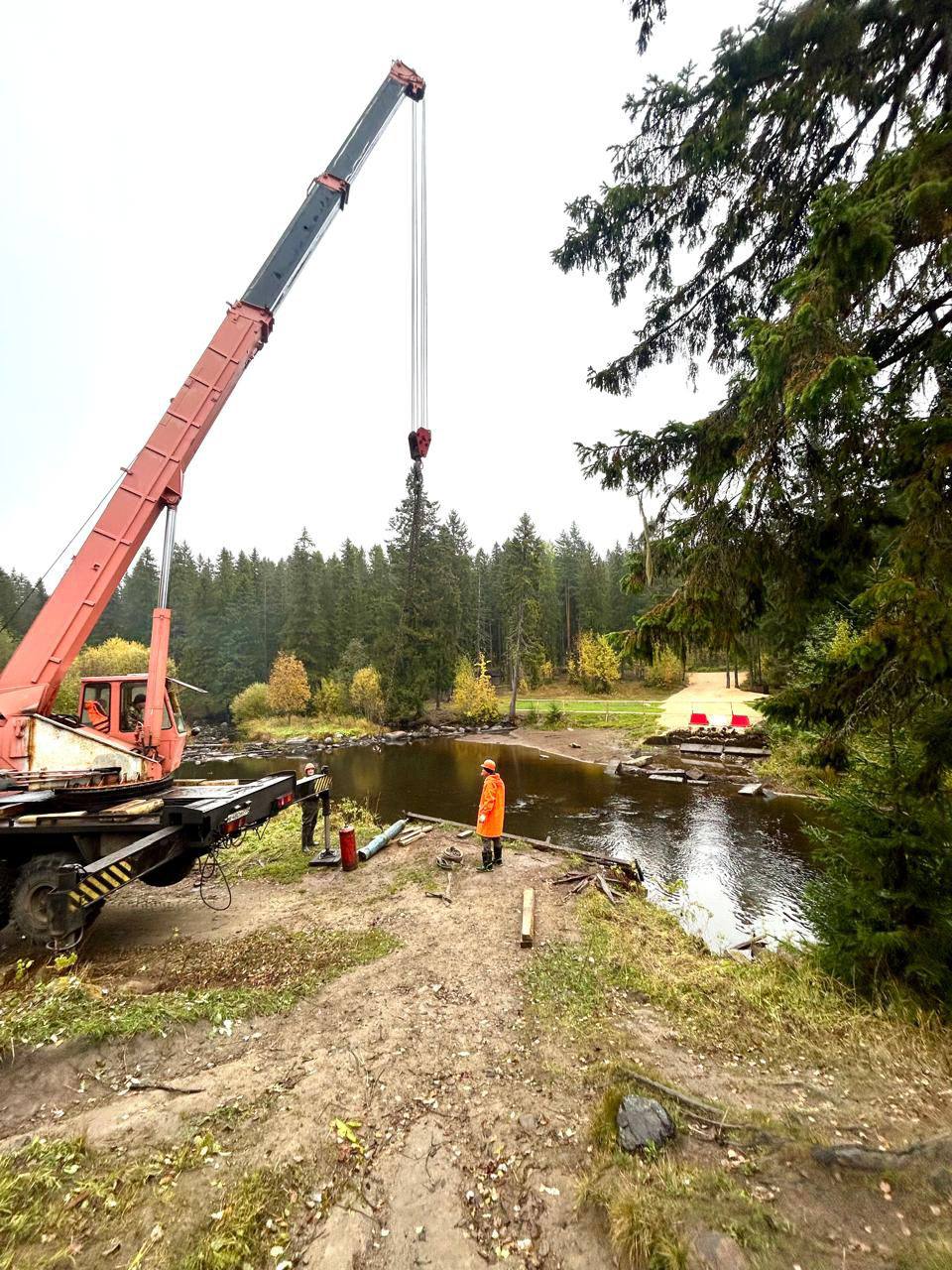 Завершили демонтаж Курганского моста. Сегодня подрядчик приступит к строительству новой переправы через реку Лососинка — будет готовить основание для свай.