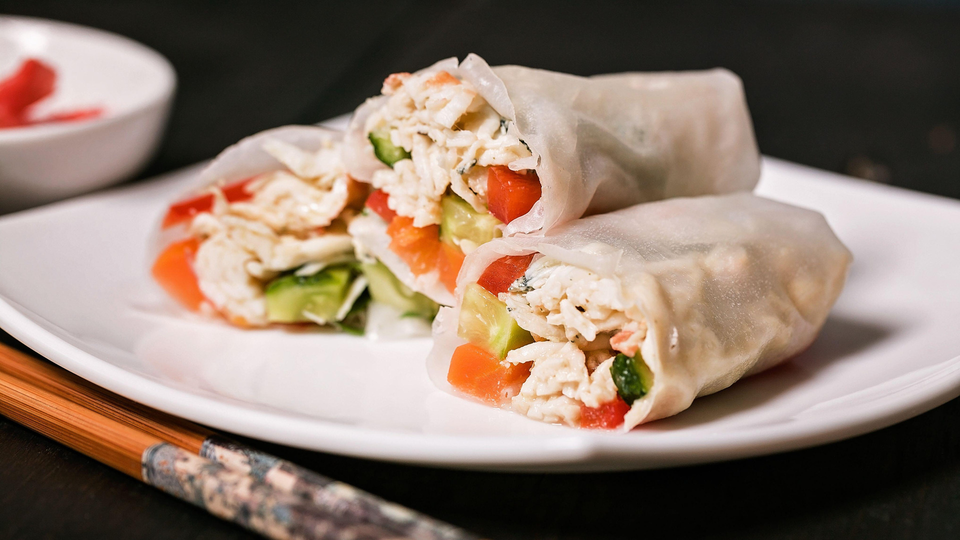 Четыре раскрытые палочки положите друг на друга так, чтобы белая часть была внутри, а красная — снаружи. Положите в середину начинку и одну дольку огурца, плотно заверните в рулетик.