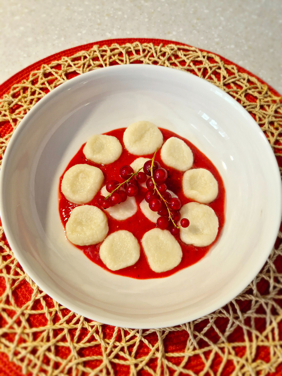 Когда вареники готовы, их вынимают с помощью шумовки и аккуратно укладывают на тарелку, на которую предварительно налит соус. Завершение блюда — это простое, но эффектное украшение вареников веточкой смородины. Такой завтрак получит признание за свою легкость, свежесть и визуальную привлекательность.