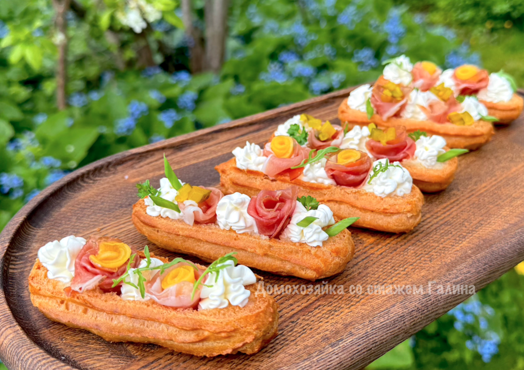 Для приготовления используются нежные эклеры, основа которых – это заварное тесто. Такой выбор гарантирует, что закуска получится легкой и воздушной. Комбинация прошутто с освежающим манго и яркой руколой превращает простое угощение в гастрономический шедевр.