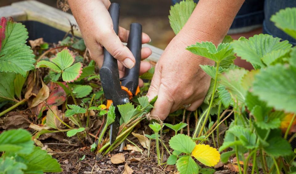 - Удаление усов: После сбора урожая клубника активно пускает усы с дочерними розетками. Если размножение не планируется, то усов лучше удалить, чтобы не истощать кусты.