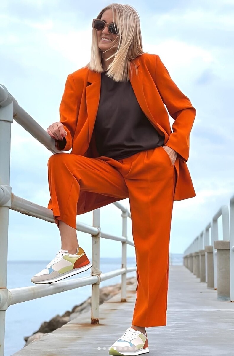 - Костюмы в ярких тонах: К примеру, терракотовый комплект из классических брюк со стрелками и жакета оверсайз, дополненный черной шелковой блузкой и белыми кроссовками, создает эффектный лук с актуальным звучанием.
