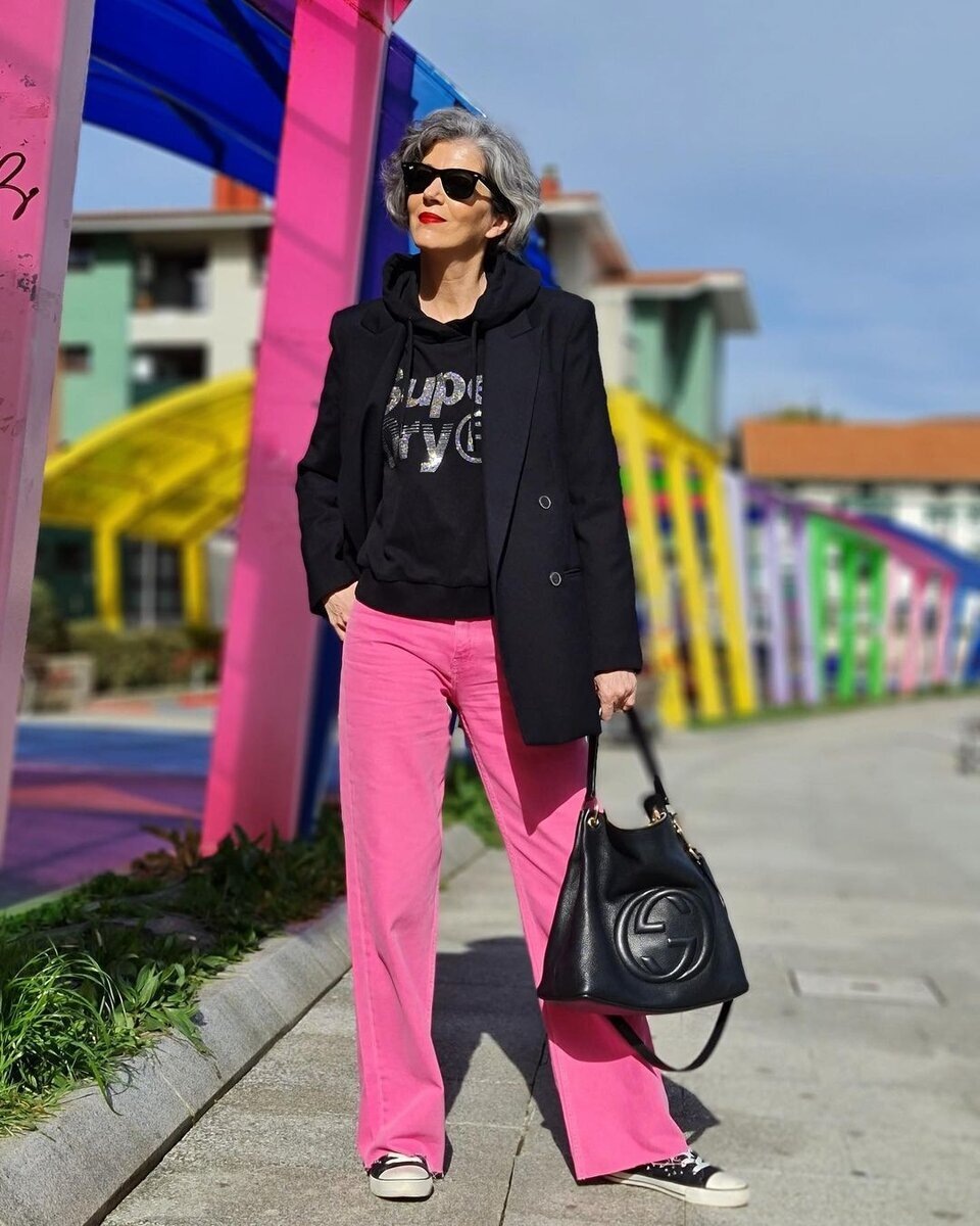 - Идеальные розовые брюки. Розовые джинсы прямого кроя прекрасно дополняются черной толстовкой и классическим жакетом. Этот образ выглядит свежо и стильно, избегая эффекта «постаревшей куклы».