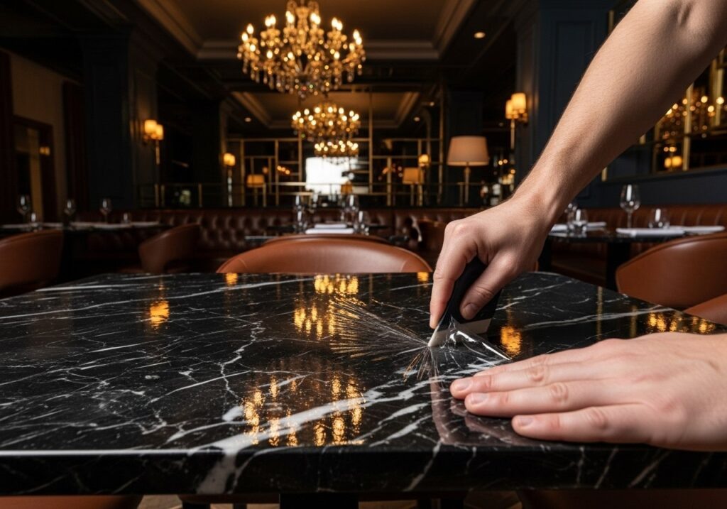 Защитная пленка представляет собой идеальный баланс между высоким уровнем защищенности и эстетикой. Она не только защищает мрамор, но и существенно упрощает процесс ухода за столешницами. Простота в использовании и отсутствие обязательной повторной обработки — вот что делает эту технологию особенно привлекательной для ресторанного бизнеса.