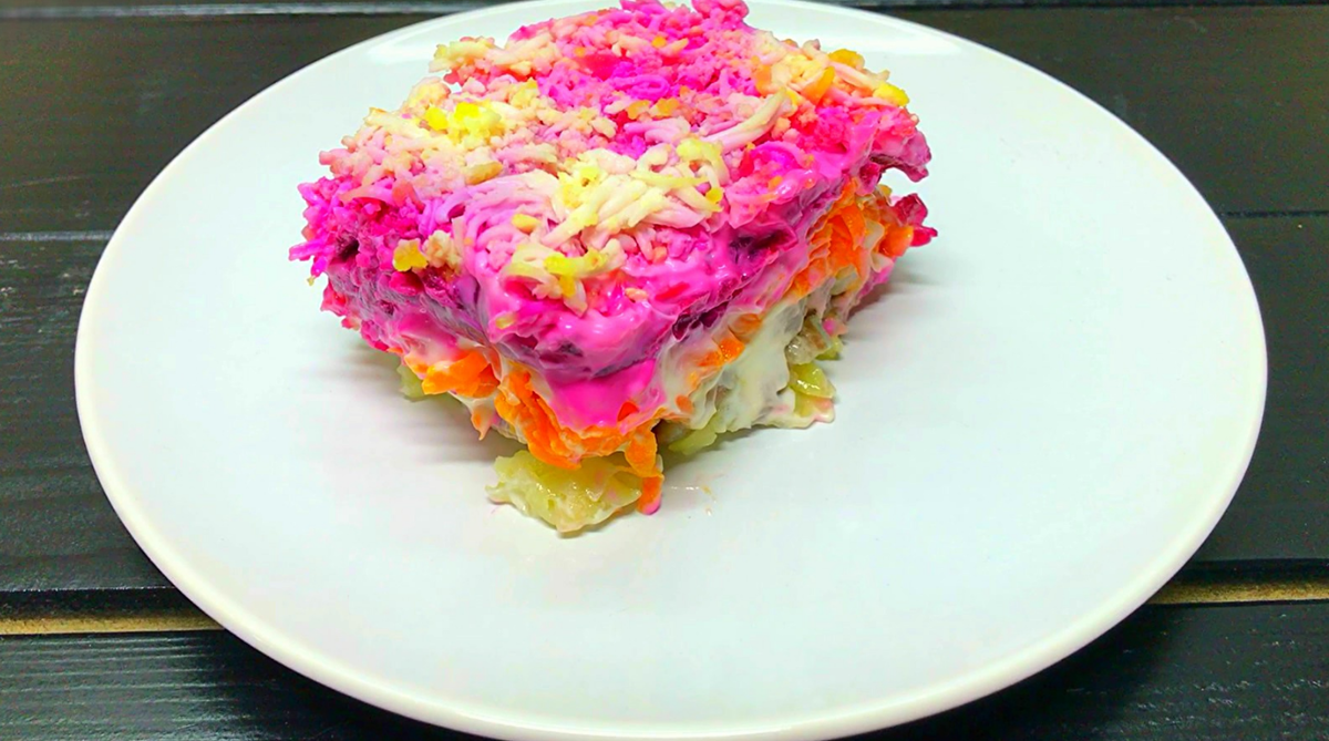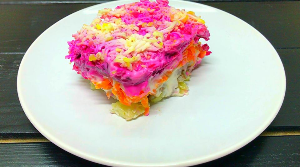 Есть простой способ проверить, что салат готов: когда верхний слой майонеза начнет приобретать розоватый оттенок, это гарантирует, что все ингредиенты соединились в идеально сбалансированную гармонию.