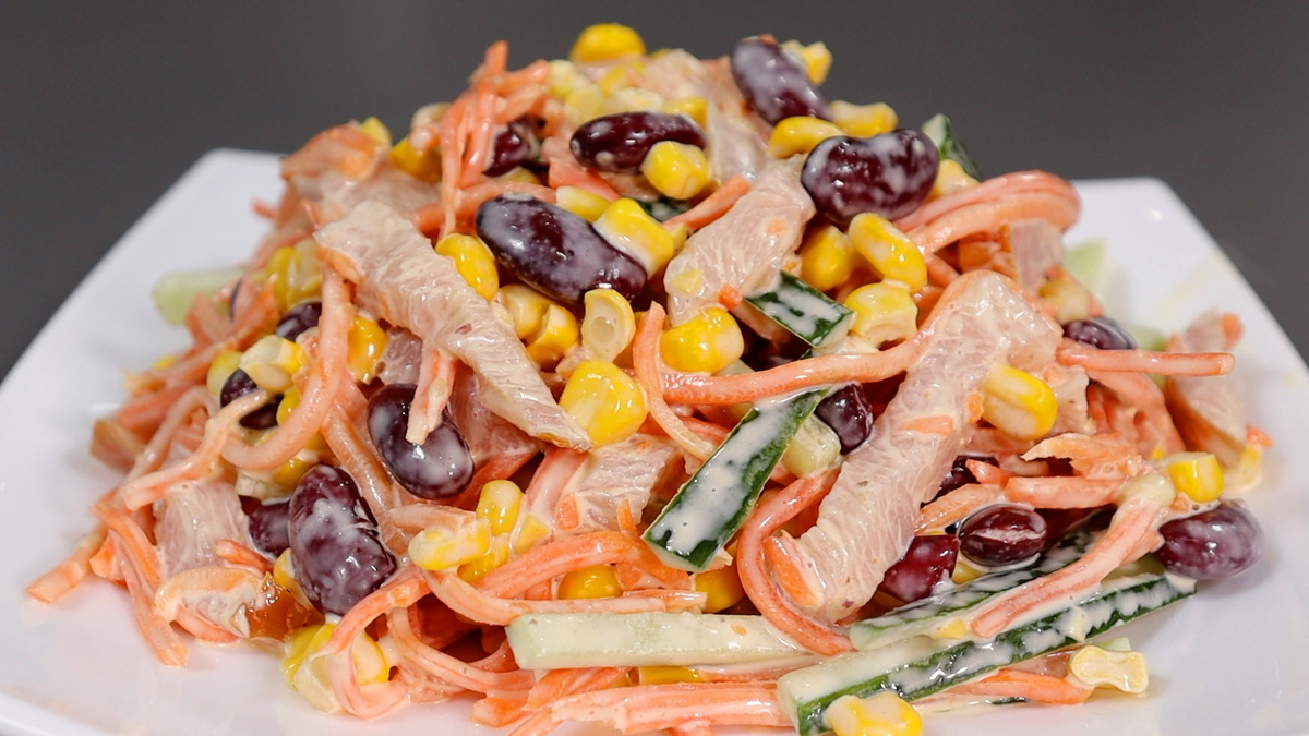 Все подготовленные ингредиенты помещаются в большую миску: огурцы, карпаччо, консервированная красная фасоль и кукуруза, а также морковь по-корейски. Посолить по вкусу и заправить майонезом. Сладковатый вкус кукурузы гармонично уравновешивается нежной фасолью, создавая совершенный вкусовой баланс.