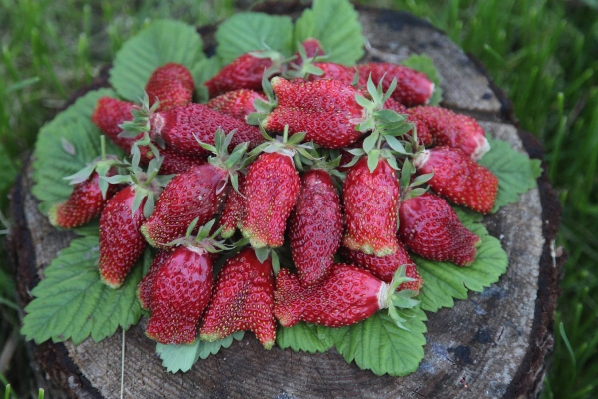 Кусты земклуники впечатляют своей мощью и декоративностью. Они образуют высокие, хорошо облиственные растения с цветоносами, которые гордо поднимаются над зеленью. Блестящие цветы распускаются в большом количестве, а завязываемость плодов почти достигает 100%. Ягоды, красные с легким фиолетовым оттенком, являются плотными и ароматными, а их уникальный мускатный запах перекрывает все другие сорта. При этом они остаются устойчивыми к переработке: не разваливаются, прекрасно сохраняют форму и цвет, что делает их идеальными для замораживания и использования в кулинарии.
