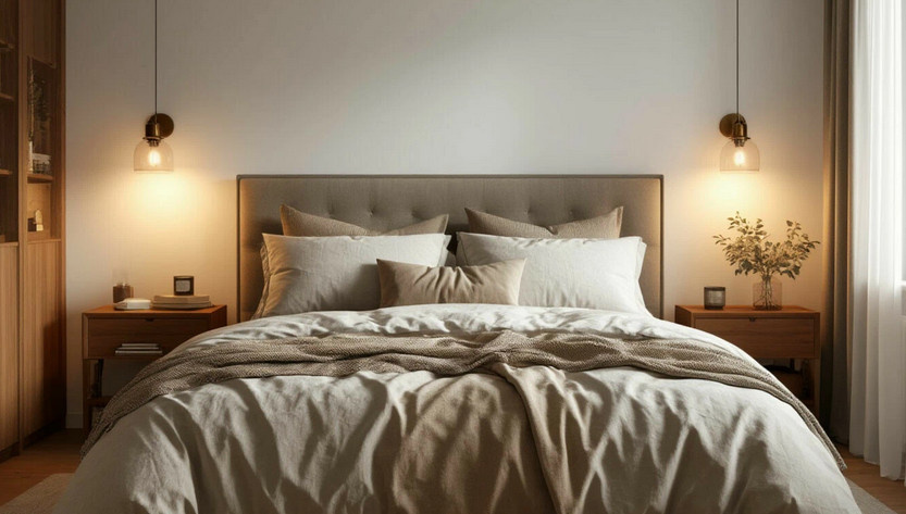 Синий свет экранов подавляет выработку мелатонина — гормона, отвечающего за сон. Больше всего это касается телевизоров и гаджетов. Кроме того, они проносят в ваше спокойное пространство чужие истории и эмоции. Попробуйте временно убрать все экраны из спальни и заменить вечерние сериалы на чтение книг или медитацию. Что касается освещения, откажитесь от резкого холодного света. Установите теплые лампочки и добавьте источники мягкого света, такие как бра или торшеры. Свет должен быть уютным и создающим атмосферу, а не резким и невыносимым.