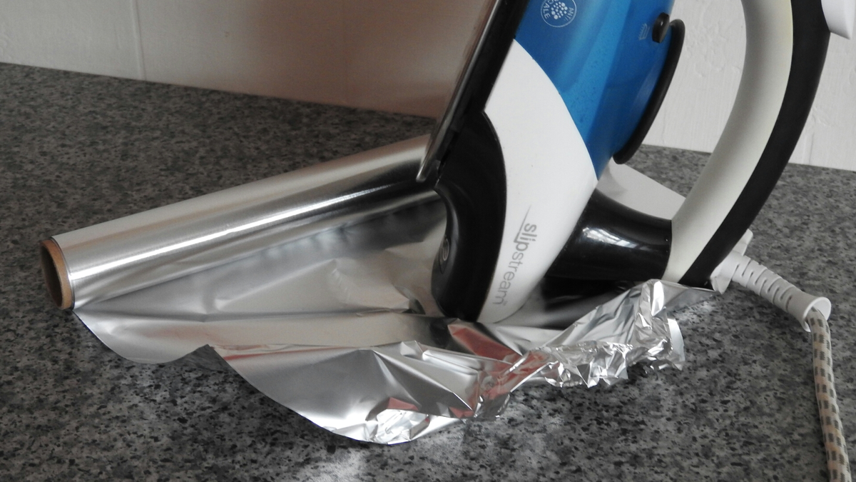 - Для удобства можно обернуть гладильную доску фольгой и закрепить её внизу с помощью скотча. Это предотвратит спадения фольги во время работы.