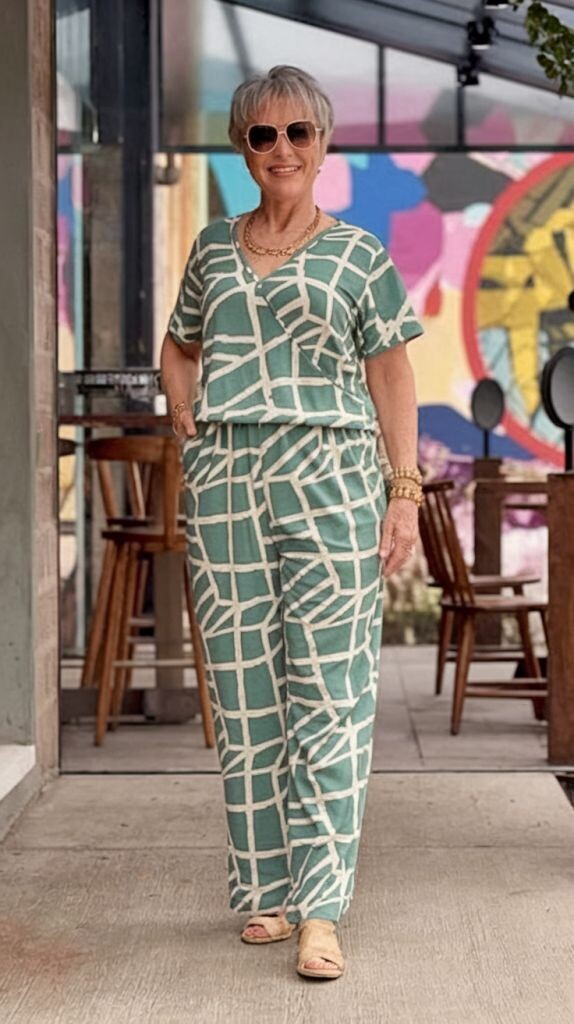 - Легкий зеленый костюм: Составленный из свободных прямых брюк и белой блузки с асимметричным клетчатым принтом, этот наряд станет идеальным решением для жарких дней, обеспечивая стиль и комфорт одновременно.