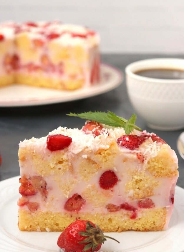 6. В оставшуюся йогуртовую массу добавить нарезанный кубиками бисквит и оставшуюся клубнику, аккуратно перемешать. Вылить смесь в кольцо с застывшим первым слоем, посыпать кокосовой стружкой.