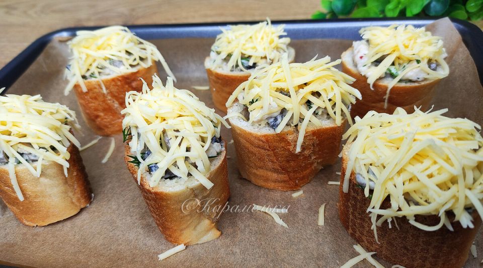 Заполните багетную основу начинкой, посыпьте тёртым сыром и запекайте в духовке при 180°C в течение 5–7 минут. Готовые 'пенёчки' украсьте петрушкой и подавайте к столу — они станут настоящим хитом вечера!