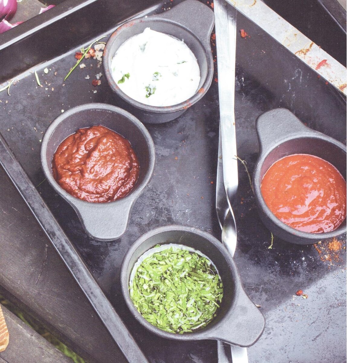 Этот освежающий соус идеально дополнит любое гриль-блюдо. Вам понадобятся: 500 мл густого натурального йогурта (жирность 10-12%), 2-3 зубчика чеснока, 1 ст.л. рубленой мяты, 1 ст.л. тахини и немного соли.