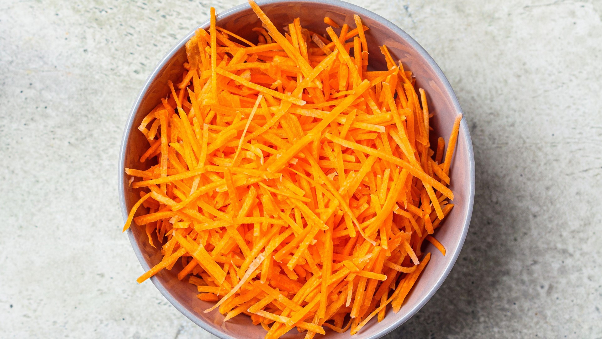 Кардинально преобразить блюдо поможет мед. Но прежде чем готовить заправку к салату, измельчите морковь. Овощ необходимо натереть на крупной или «корейской» стороне терки. Также не забудьте порубить зелень.