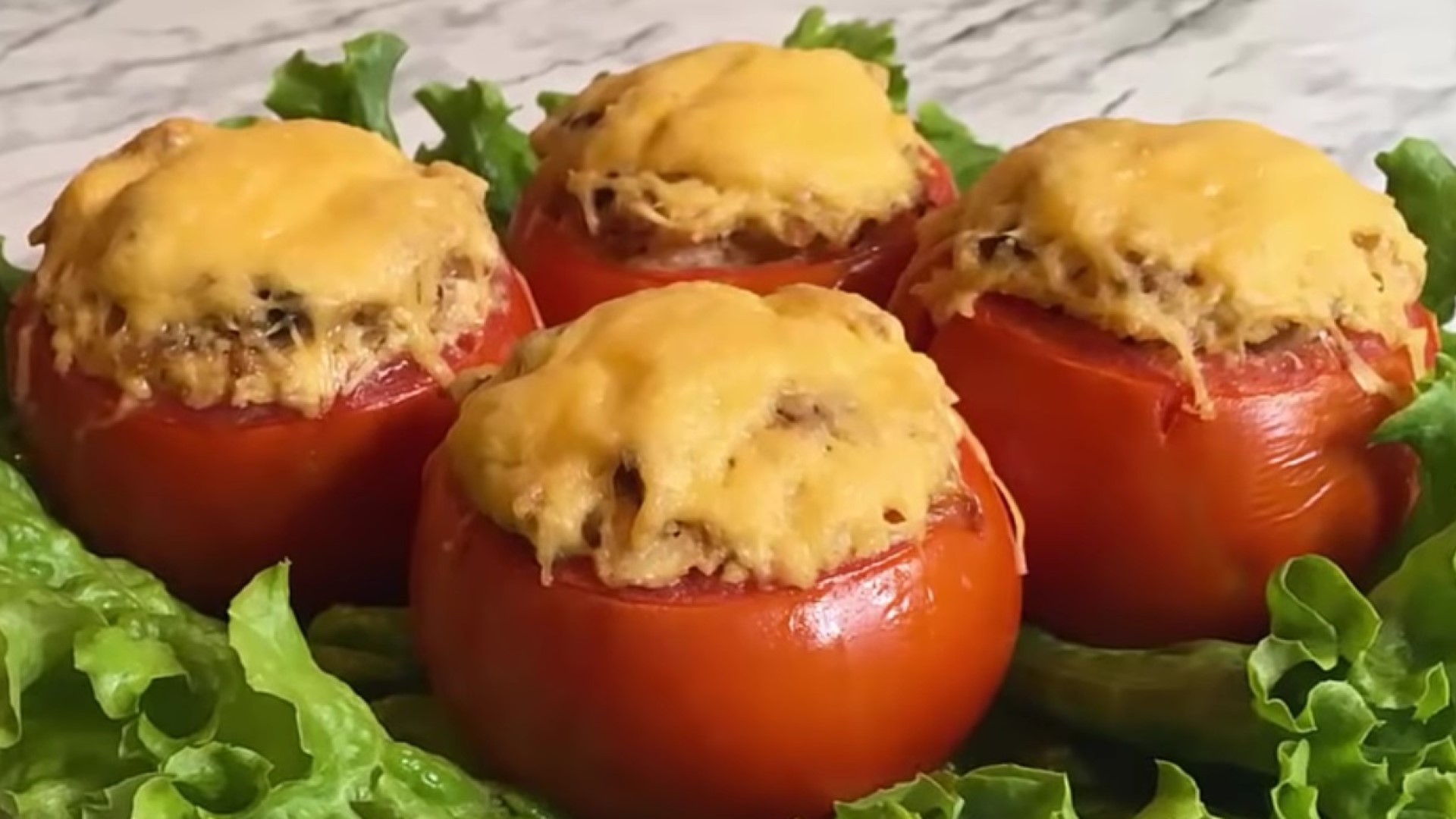 Не спешите резать помидоры в салат, из них можно приготовить восхитительную закуску. Блюдо будет красиво смотреться даже на праздничном столе, а гости точно придут от него в восторг.