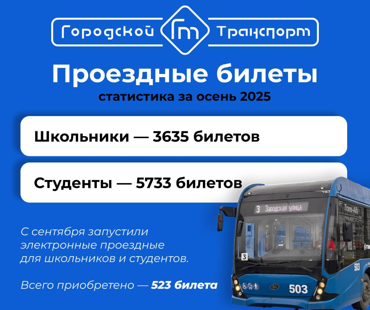Напомню, с сентября этого года мы запустили электронные проездные. С каждым месяцем горожане всё активнее оформляют электронные проездные для школьников и студентов. Всего приобретено электронных билетов — 523. Пока это около 5% от всех проданных проездных, мы видим растущий интерес к современному и удобному формату!