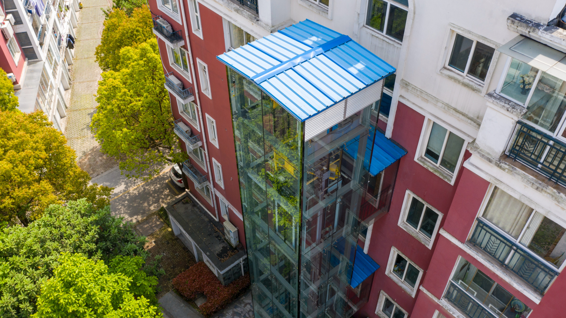 Лифт во многих китайских высотках вынесен за пределы здания. К «панельке» пристроена стеклянная шахта, в которой работает подъемник.