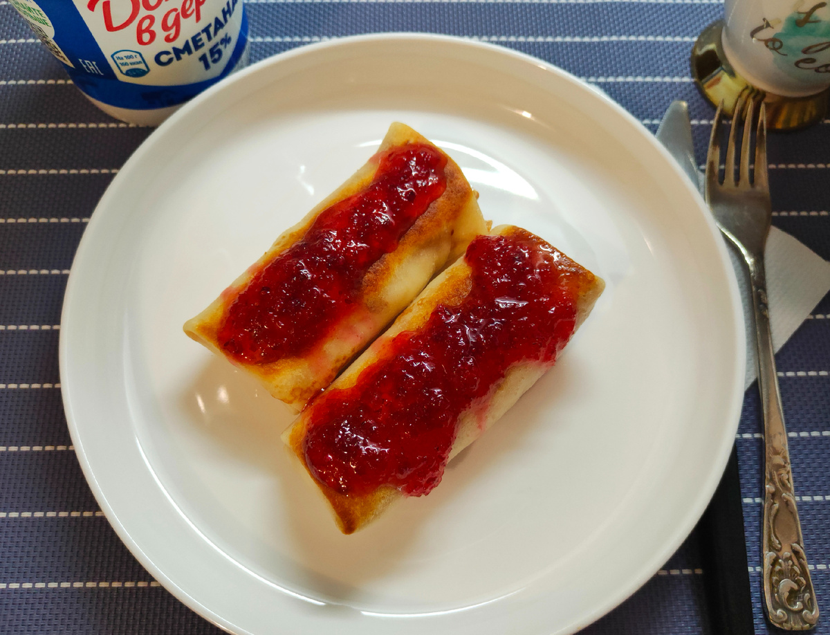Завтрак начался с блинчиков c творогом, поданных со сметаной и протертой клюквой, а также с ароматным кофе. На обед ожидала лапша-вок с куриной грудкой и овощами, а на ужин были картофельные палюшки со сметаной и чай.