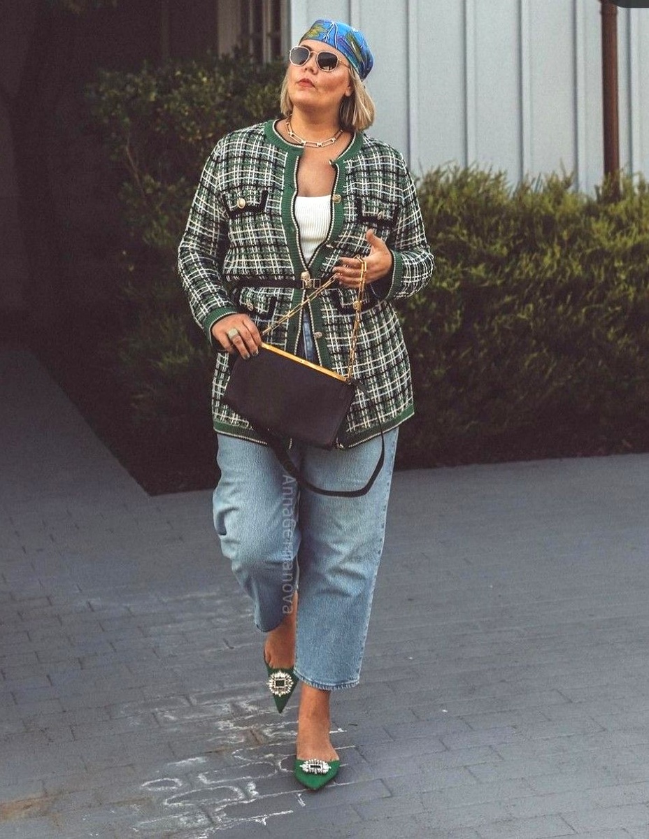 - Прямые укороченные джинсы прекрасно смотрятся с базовой белой футболкой, дополненной твидовым кардиганом в клетку. Для акцента можно использовать тонкий ремень, а стиль завершат остроносые замшевые туфли изумрудного цвета.