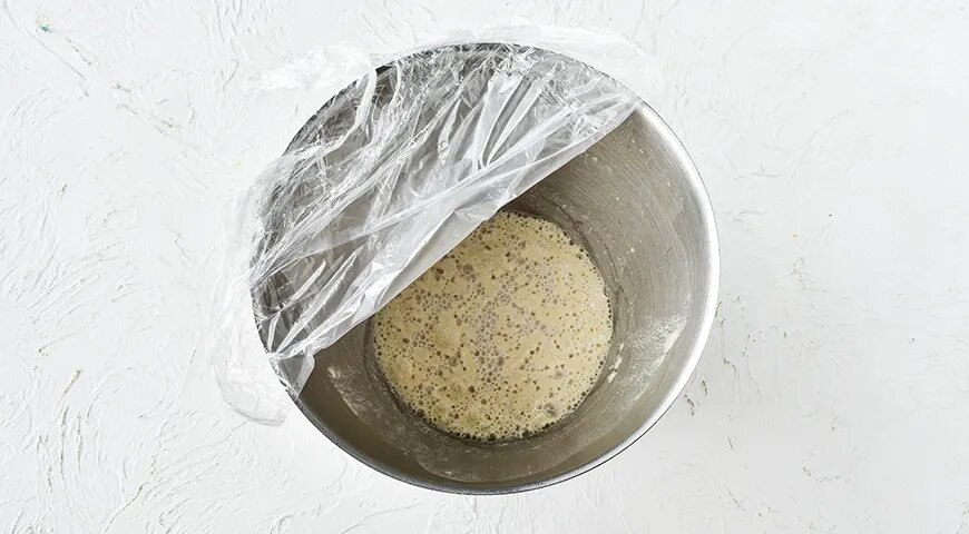 После завершения этого времени на поверхности появится пена. В это время добавляют 400 г просеянной муки и соль, тщательно перемешивая тесто. Не забудьте влить растительное масло и снова все хорошо вымесить. Если тесто слишком липкое, можно добавить немного оставшейся муки. Оно должно быть мягким, но в то же время упругим.