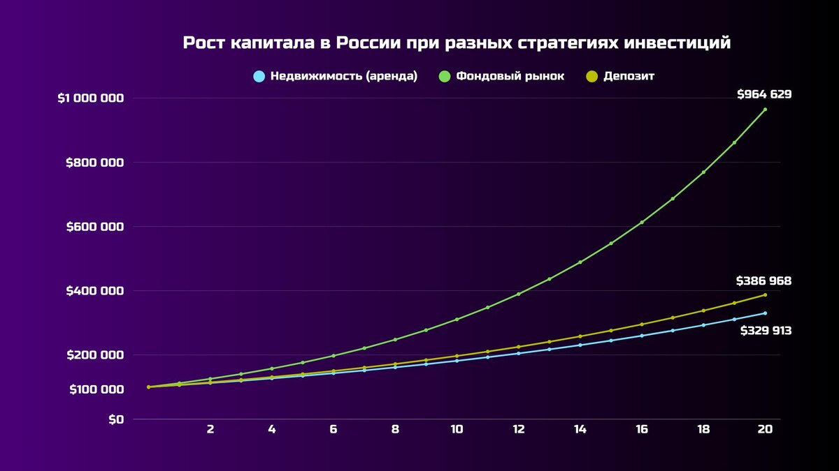 В отличие от вкладов и аренды, фондовый рынок может порадовать значительно более высокими доходами. Историческая средней прибыльность индекса S&P 500 в США составляет 10-11% годовых, включая дивиденды. Даже на российских биржах за последние два десятка лет можно наблюдать прибыльность около 12-15% в рублях, если выбирать проверенные компании. Если взять ту же сумму в 100 000 долларов и инвестировать под 12% годовых, через 20 лет капитал вырастет до 960 000 долларов, что в три раза больше, чем с депозитом, и в 2,5 раза больше, чем от аренды.