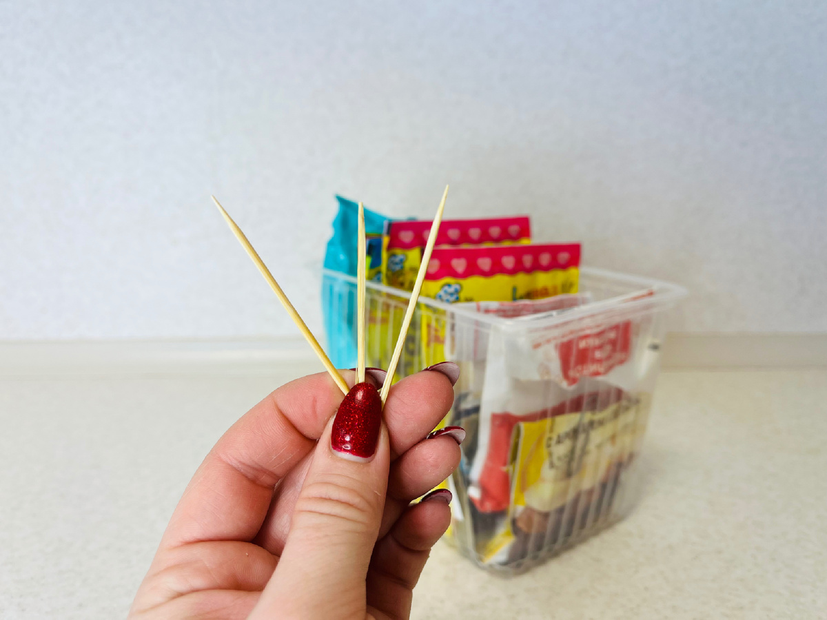 Зубочистки — это тот самый предмет, который часто теряется среди кухонных принадлежностей. Вместо того чтобы хранить их без дела, они могут стать идеальным инструментом для закрытия бумажных упаковок со специями. Вот как это сделать: