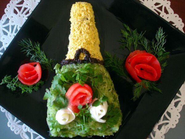Теперь пришло время для креативного оформления. Салат нужно выложить на овальную тарелку, формируя его в виде бутылки шампанского. Для этого нижнюю часть идеально украсить натертым огурцом, а горлышко обсыпать раскрошенными желтками. Можно использовать белок для создания «пробки», либо украсить его половинками вареных яиц. В завершение ободок горлышка оформляется колечками из маслин, добавляя нотку изящества в подачу.