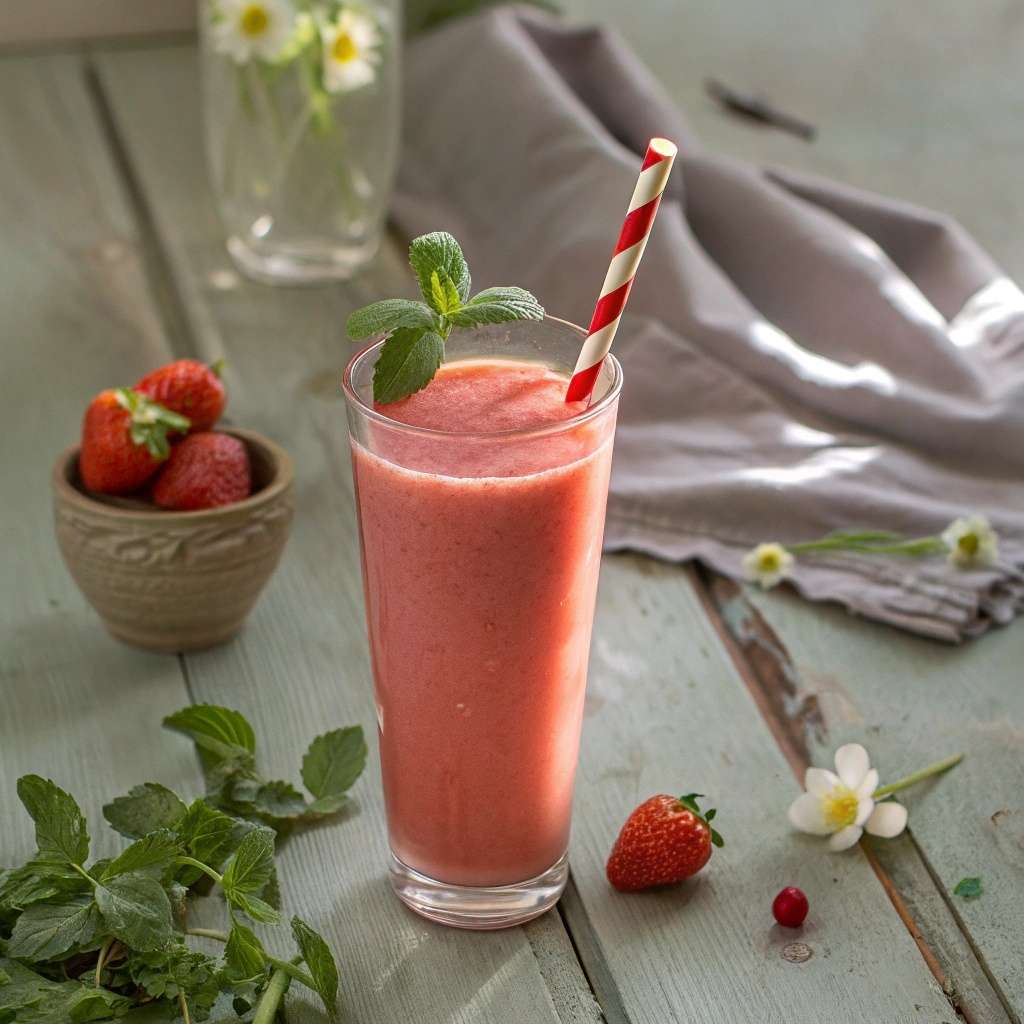 - Приготовление: Промойте и нарежьте клубнику, очистите и нарежьте банан. В блендере смешайте все ингредиенты, взбивайте на максимальной скорости до однородной массы, разлейте по стаканам и подавайте с веточкой мяты.