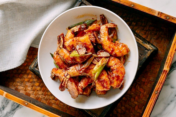 Верните креветки в сковороду, добавьте соевый соус, шаосинское вино и сахар, немного черного перца. Все смело обжаривайте, чтобы компоненты хорошо смешались. Финальным штрихом будет зелёная часть лука — добавьте её в конце и перемешайте. Блюдо готово!