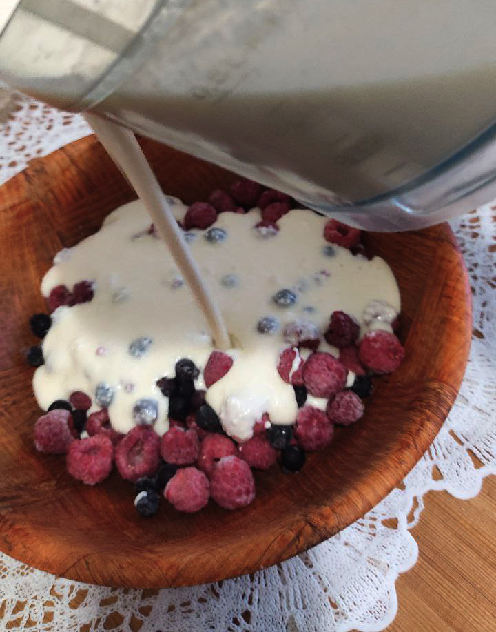 Смешивание ингредиентов происходит в кухонном комбайне, где творог, сметана, сахар и ванильный сахар становятся однородной массой. В это время можно подготовить ягоды: одна порция полуразмороженной малины и другая порция сладкой ирги добавят не только цвет, но и замечательную кислинку.