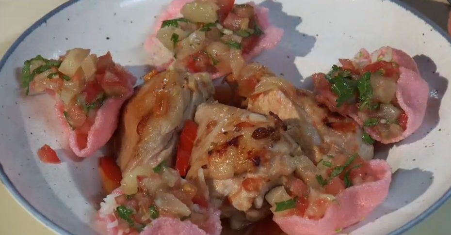 5. Отварить рис до готовности. Затем сделать сальсу, смешав консервированный ананас, помидор, кинзу и чеснок, добавив сок лайма и растительное масло.
