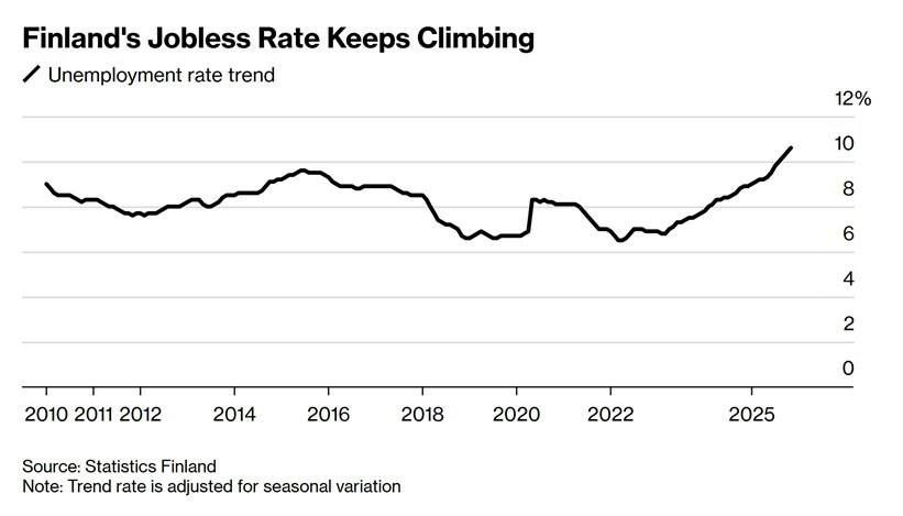 В ноябре уровень безработицы в Финляндии достиг 10,6%, что является рекордом за десятилетия.