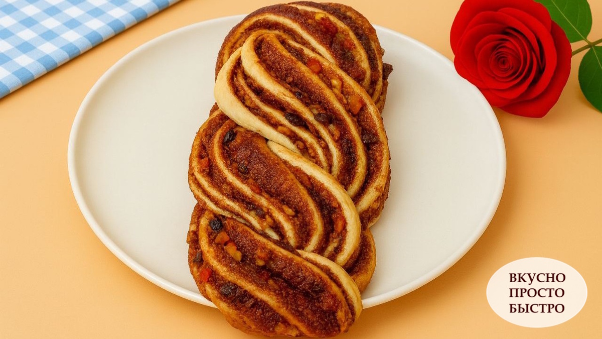 - Обомните тесто, раскатайте в прямоугольный пласт, распределите коричную смесь и начинку, затем сверните в рулет. Разрежьте рулет и скрутите его в плетёнку.