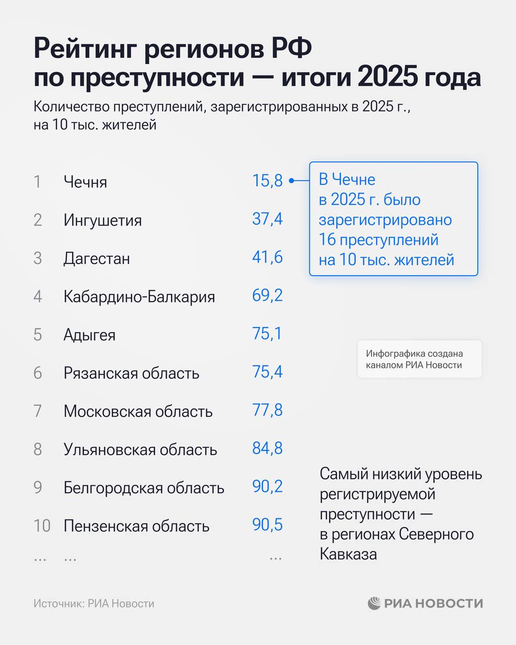Самый низкий уровень регистрируемой преступности - в Чечне, Ингушетии и Дагестане, следует из рейтинга регионов по итогам 2025 года.