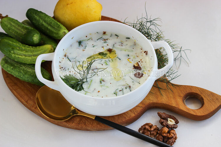 После этого зелень (прежде всего укроп и зеленый лук) тщательно моют и мелко нарезают. Все ингредиенты перемешиваются с холодным кефиром, добавляются измельченные орехи, лимонный сок и немного натертого чеснока. В завершение суп заправляется газированной водой и тщательно перемешивается. Для изысканности можно добавить немного оливкового масла в тарелку перед подачей.