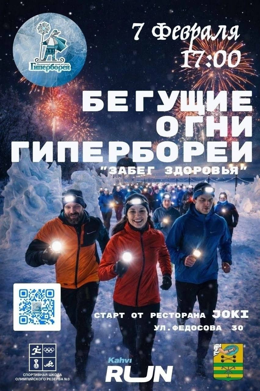 7 февраля в рамках фестиваля «Гиперборея – 2026» пройдет массовый забег «Бегущие огни Гипербореи». Начало в 17:00, с собой необходимо взять фонарик и спортивный настрой.