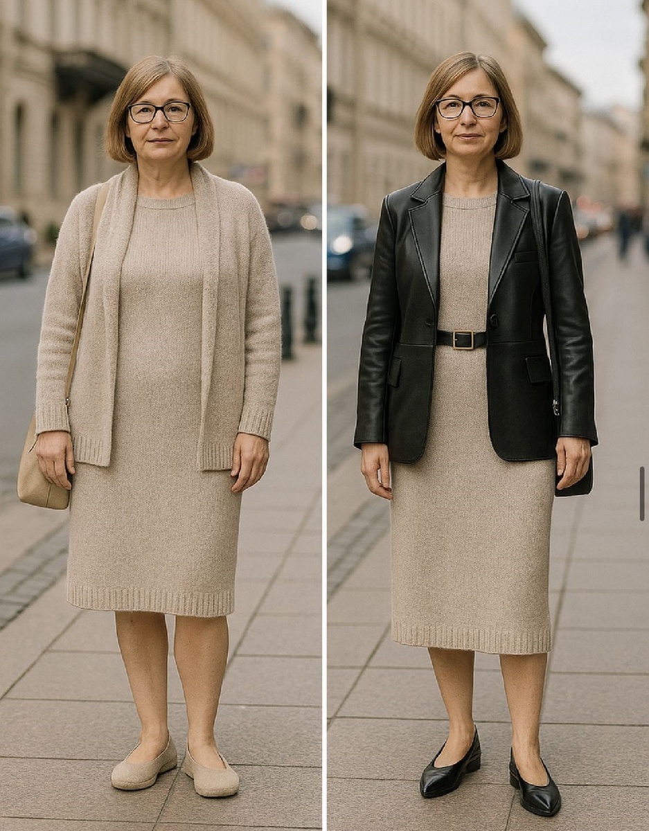 1. Бежевый трикотажный ансамбль. Лаконичное платье в сочетании с кардиганом выглядит женственно, но трикотаж может невыгодно подчеркивать фигуру. Чтобы улучшить образ, стоит добавить стильный черный кожаный ремень, акцентирующий талию, и заменить кардиган на приталенный жакет. Также нужно изменить обувь: практичные черные туфли на невысоком каблуке идеально подойдут к новому аутфиту.