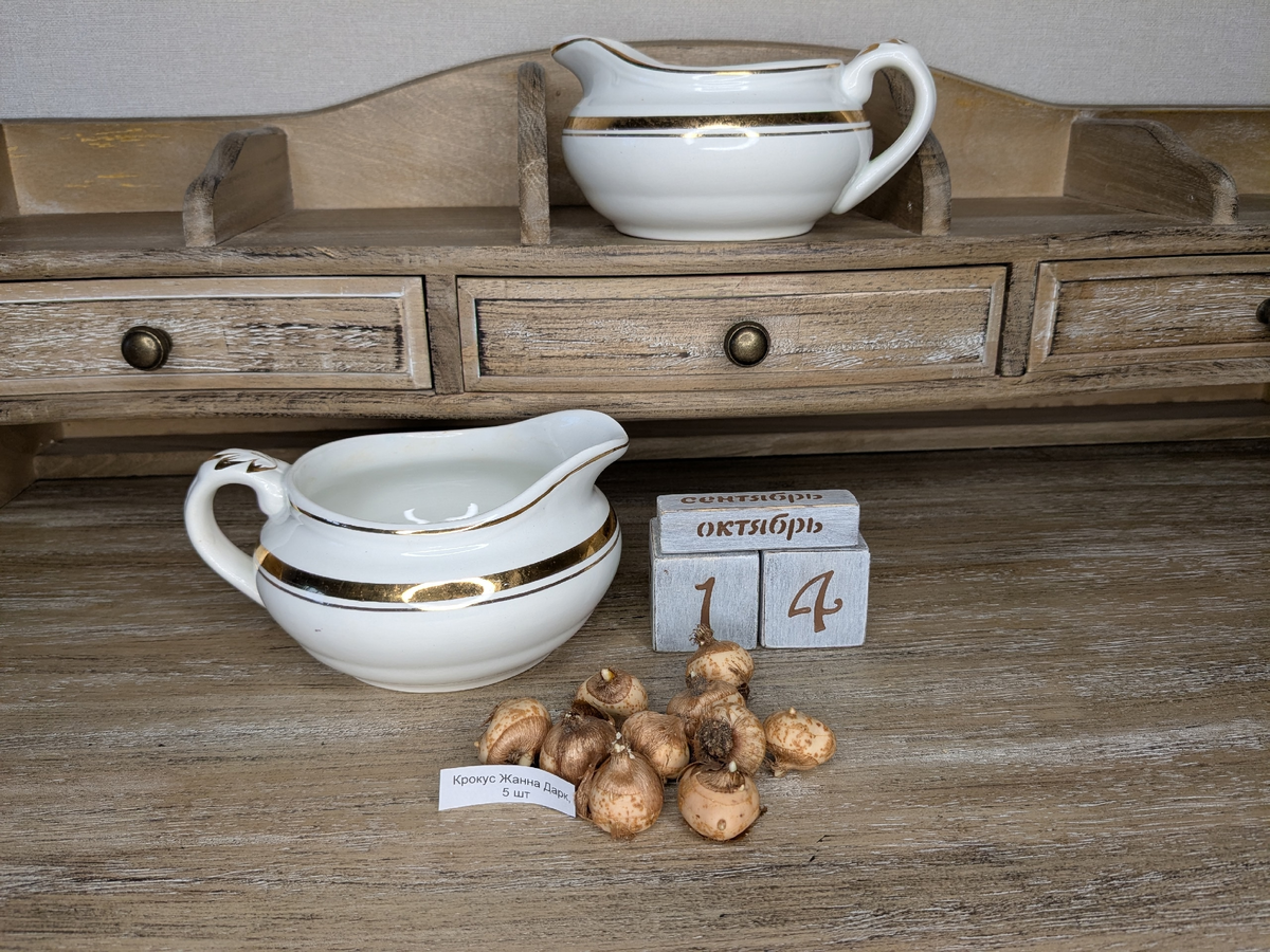 - Крокусы: Крупноцветковые крокусы — отличные кандидаты на выгонку. В этом году выбраны белый крокус Jeanne d'Arc и фиолетовый Flower Record. Сажая их по одному в каждую посудину, можно избежать проблем с совместным цветением.