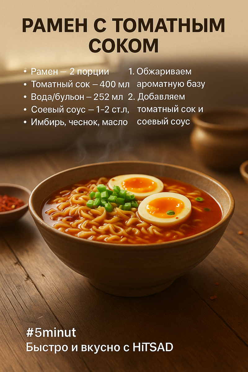 Вкус блюда обретает глубину, когда в бульоне появляется томатный сок. Именно его кислота и умами делают обычный рамен насыщеннее, а общий оттенок становится неожиданно похожим на долго томлёный мясной бульон, хотя вся подготовка занимает считанные минуты. Комбинация томатов, соевого соуса, приправ и свежего имбиря изменяет повседневную картину ужина.