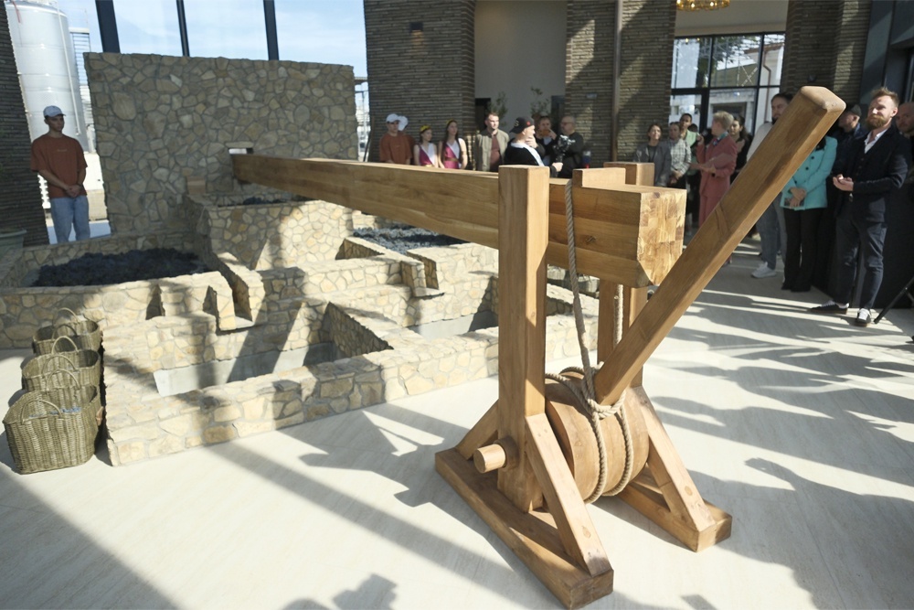 В винодельне также был воссоздан рычажный пресс, equipped with a 600-kilogram horizontal wooden beam. Это устройство, управляемое без особых усилий, спроектировано так, чтобы перерабатывать до 300 тонн урожая за сезон, что придает ему особую ценность.
