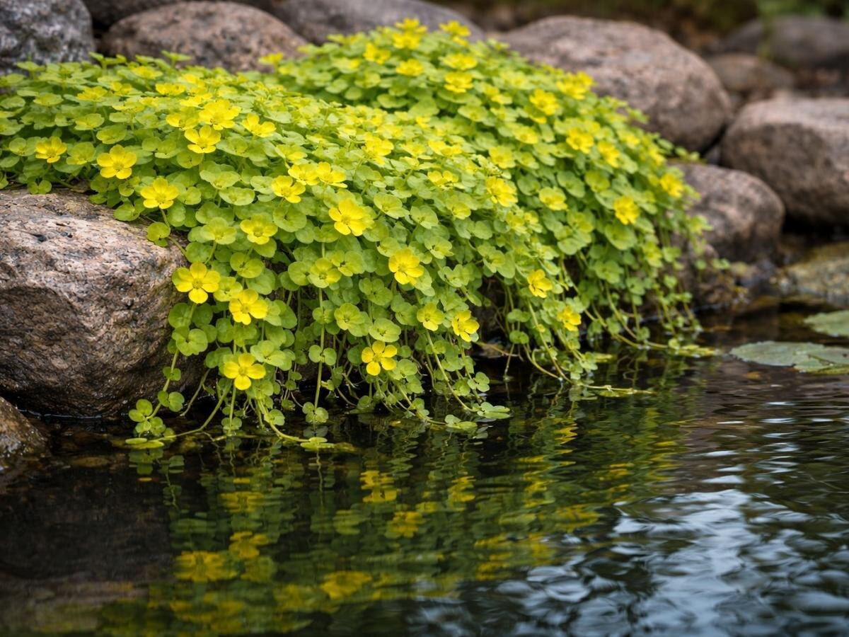 Вербейник — вечнозеленое растение, достигающее высоты 5–10 см и разрастающееся до 80 см в ширину. Его круглые листья напоминают монеты, что и послужило основой для названия. Цветки ярко-желтые и появляются с июня по июль. Примечательно, что желтолистные сорта лучше всего развиваются на солнечных участках, тогда как в тени теряется яркость окраски, но декоративные качества сохраняются.