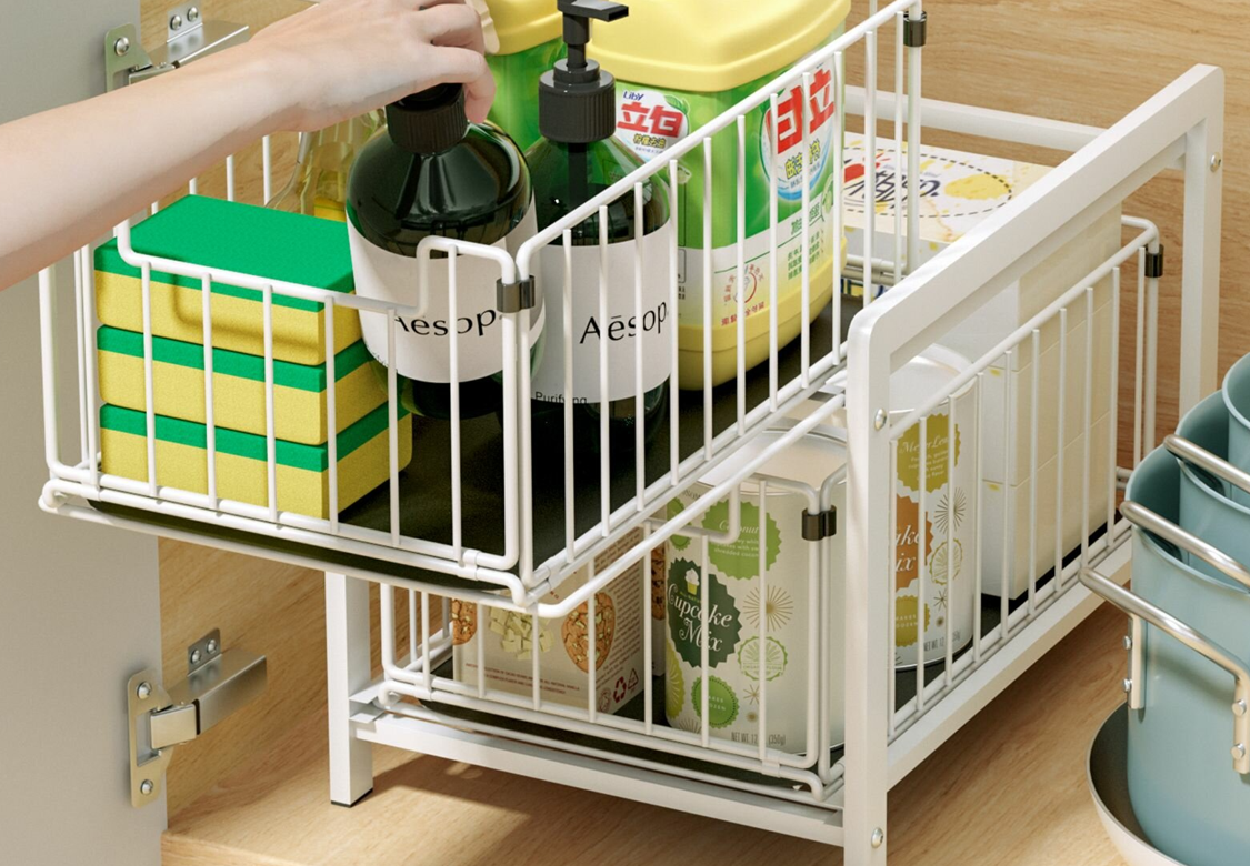 Эта двухъярусная полка из металла — находка для кухни или ванной. Она использует пространство, часто оставшееся «мертвым», и выдерживает вес бытовых химикатов. Простое выдвижение позволяет мгновенно получить доступ к необходимым предметам. Цена: 4002 руб.